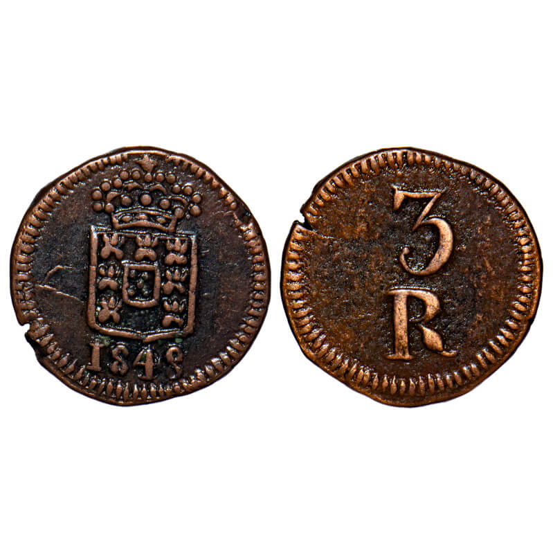 Indo Portuguese, Copper 3 Reis, 1.95g, D.Maria II (1834-1853 AD), 1848, Crowned Shield (Escudo) with date below, Rev: Denomination both sides with border of radiating lines. A.Gomes (page 595) 02.03 / KM 2579. Extremely Fine+, Scarce.