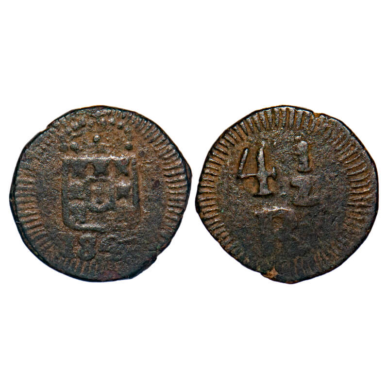 Indo Portuguese, Copper, 4 ½ Reis, 2.99g, D. Maria II (1834-1853 AD), 1845 AD. Crowned Shield (Escudo) with date below, Rev: Denomination both sides with border of radiating lines. A.Gomes (page 595) 04.02 / KM 258. VAbout Very Fine, Scarce.