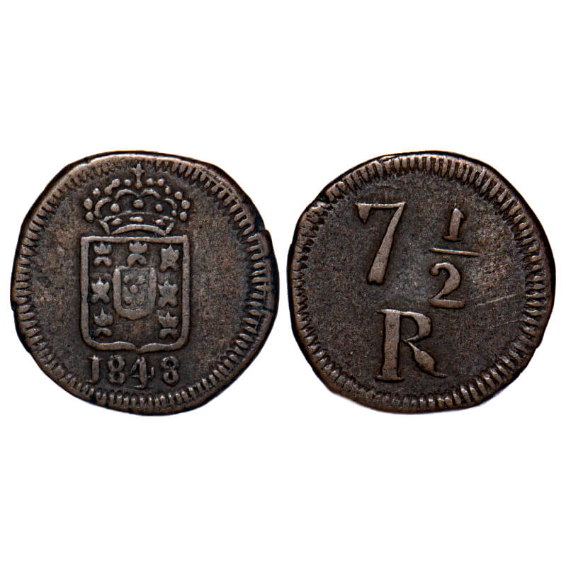 | Pourtuguese India, Copper 7 1/2 Reis, 4.53g, D.Maria II (1834-1843 AD), 1848 AD, Goa issue, Crowned Shield (Escudo) with date below, Rev: Denomination both sides with border of radiating lines. A.Gomes (page 595), 08.04/KM 260. About Extremely Fine, Rare. |