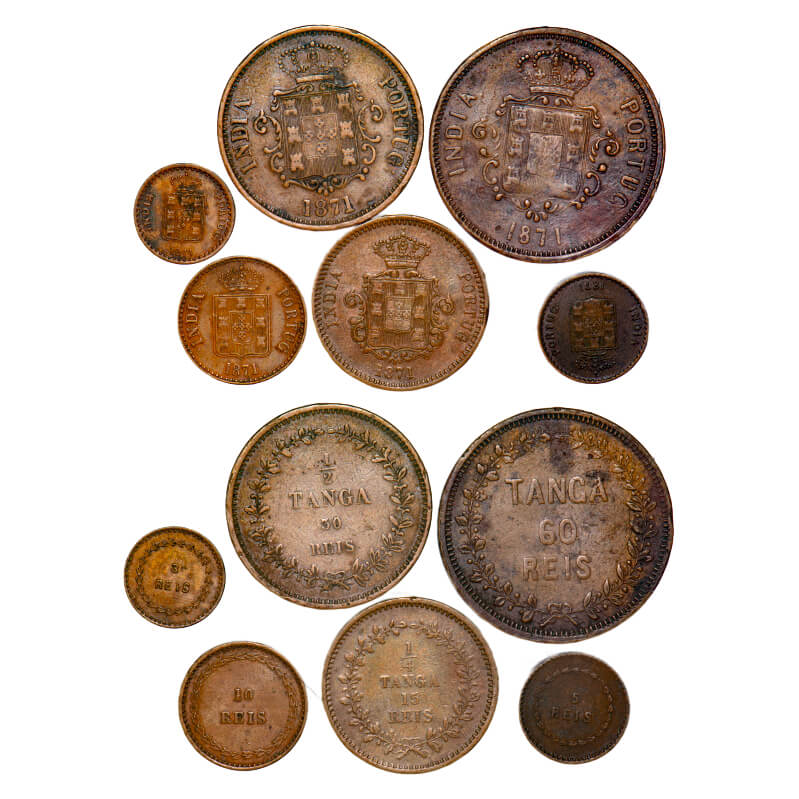 | Indo Portuguese, Copper, 60, 30, 15, 10, 5, 3 Reis (6), D Luis (1861-1889 AD), 1871 AD, Goa issue, Coat of arms and date on obverse, denomination on reverse, A.Gomes (page 601-602), 03.01, 04.01, 05.01, 06.01, 07.01, 08.01 / KM 306, 305, 304, 303, 302, 301. Very Fine, Rare. |