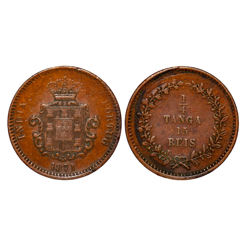 | Indo Portuguese, Copper, ¼ Tanga / 15 Reis, 9.44g, D. Luis (1861-1889 AD), 1871 AD, Goa issue, Coat of arms and date on obverse, denomination on reverse, A.Gomes (page 602) 06.01 / KM 304. Very Fine+, Scarce. |