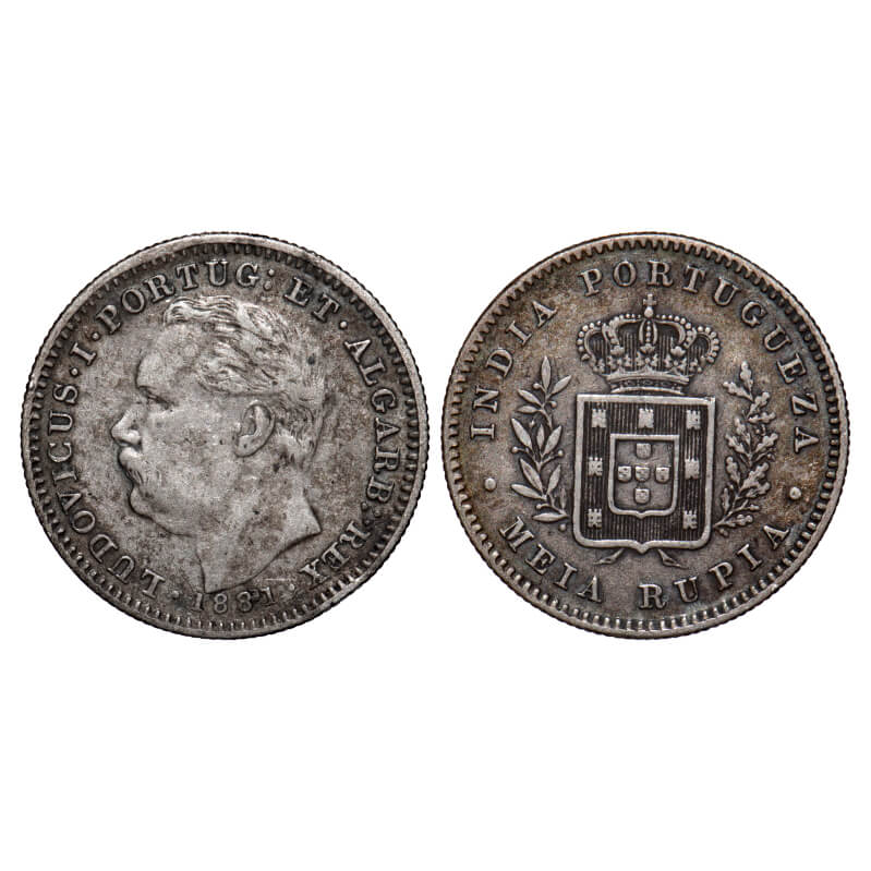 | Indo Portuguese, Silver ½ Rupia, 5.78g, D Luis (1861-1889 AD), 1881 AD, Goa issue, date, Bust to left on obverse, & Coat of arms and Meia Rupia on reverse, A.Gomes (page 602), 13.01 / KM 311. About Extremely Fine, Scarce. |