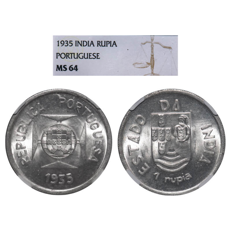 Indo Portuguese, Silver Rupee, Republic (1910-1961 AD), 1935 AD. A.Gomes (page 606) 10.01 / KM 22. NGC slabbed MS 64, Scarce.