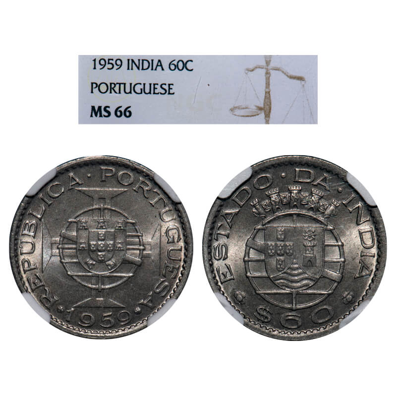 Indo Pourtuguese, Copper Nickel, Republic, 60 Centavos 1959. A.Gomes (page 606) 15.02. KM 32. NGC graded MS 66, Very Scarce.