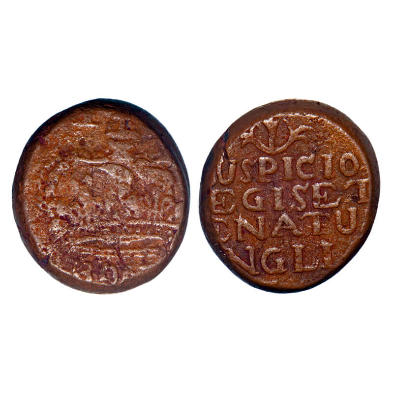 | Bombay Presidency, Copper 2 Pice, 17.89g, (1728-1749 AD issue), Obv: a large crown divides G R, (BOMB) below the crown, Rev: AUSPICIO/REGIS ET/ SENATUS/ ANGLIAE and date below, P.Stevens (Page 233) 2.97 types/F.Prid (99-103 type). About very Fine, Rare. |