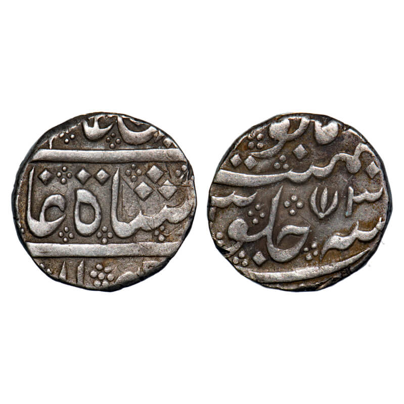 | Madras Presidency, Silver Rupee, 11.44g, (1754-1759 AD Issue), lotus type, 3 RY, (Arcot) mint, INO Alamgir II. P.Stevens (Page 384) 2.60 / F.Prid Unlisted. Very Fine, Scarce. |