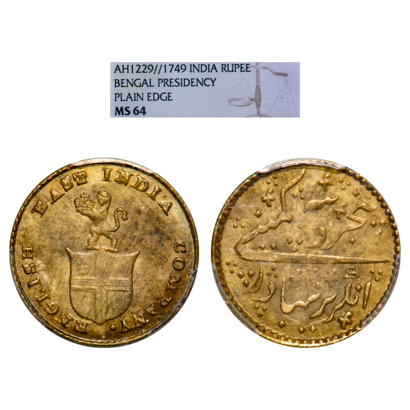Madras Presidency, Gold 5 Rupees/ 1/3rd Mohur, 3.86g, 1820 AD issue. Obv: Company's arms without supporter and motto. ENGLISH EAST INDIA COMPANY Rev: Persian legend Panj Rupia Kampani Angrez Bahadur. Edge grained. P.Stevens (Page 489) 4.4/ PR 244. PCGS graded MS 63, Very Rare.