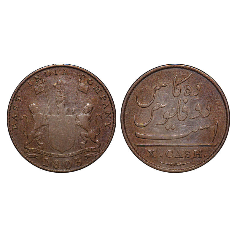| Madras Presidency, Copper X (Ten) Cash, 6.28g (Heavy Issue), Struck at Soho Mint, 1803 AD, Obv: Coat of Arms of Company with date below Plain Edge, Rev: 'Das Kas do Falus Ast' in Persian and Value in English 'X Cash'. P,Stevens (Page 531) 5.126/F.Prid. 199. About Very Fine, Very Scarce. |