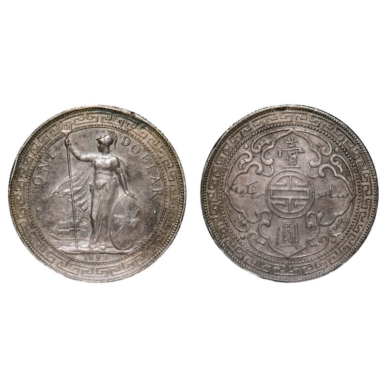 | Great Britain, Silver Dollar (0.900 silver), 26.87g, Trade Coinage, 1899 AD, Bombay Mint B Incuse in Trident, Obv: Standing figure of Britannia holding trident and shield with merchant ship in background, date in exergue, Rev: Chinese characters and Jawi script in ornamental flower. (minor traces of loop removed), KM T5, Toned About Extremely Fine, Scarce. |