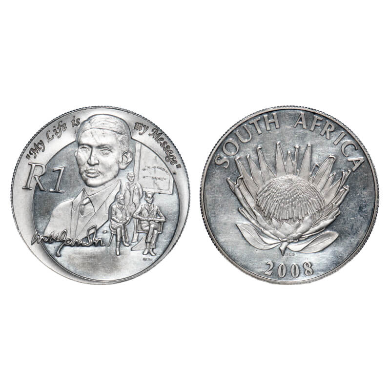 | South Africa, Silver 1 Rand, (0.925 Silver), 15.03g, 2008, Commemorative issue, Nobel Prize Winners series, Obv: A King Protea in full bloom, SOUTH AFRICA, 2008 ALS, Engraver: Arthur Sutherland, Rev: Frontal figure of Mahatma M K Gandhi as young lawyer. Three figures next to bust. My life is my Message" around top, R1, MJS, Engraver: Thinus Scheepers, Edge. Reeded. KM 451, Uncirculated, Scarce. |