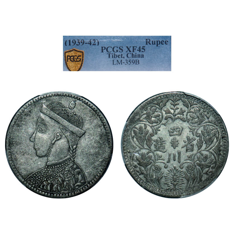 Tibet, Silver Rupee, Trade Coinage (1939-42 AD), Obv: large bust with collar, Rev: Vertical Rosette, KM Y 3.3 type/LM 359B. PCGS graded XF 45, Rare.