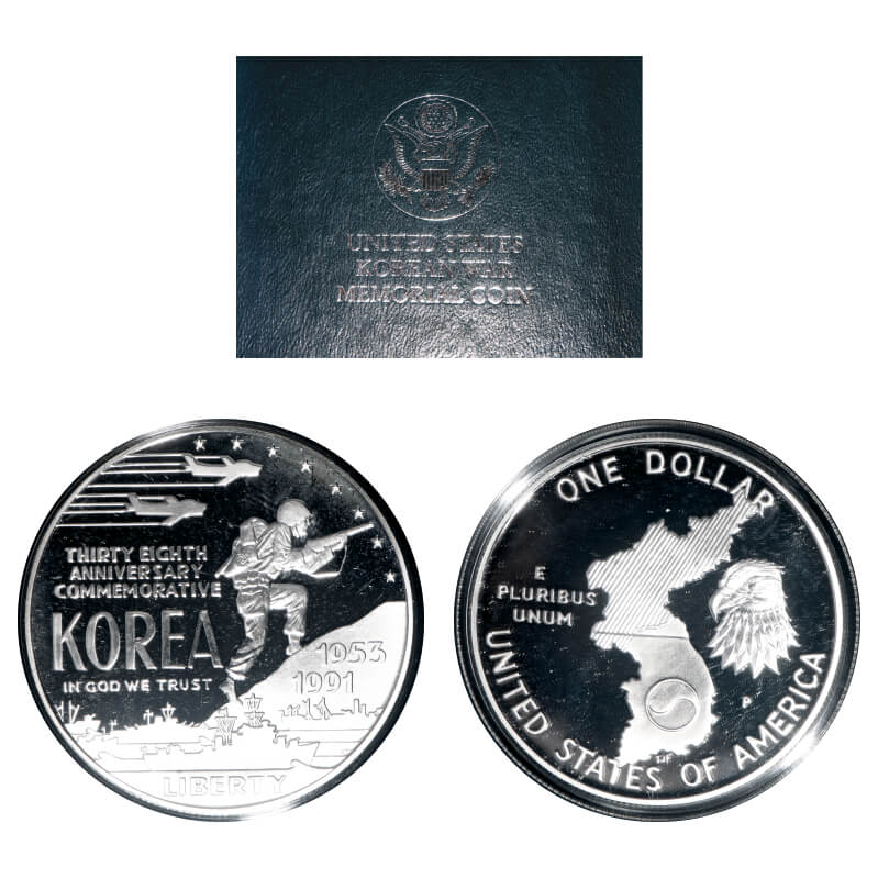 | United States of America, Silver Dollar Proof (0.900 silver), 26.73g, 1991, Korean war Memorial (1953-1991), 38th Anniversary, Obv: Army Navy & Airforce motives. & date, In God We Trust, Rev: Eagle and denomination, United States Of America. KM# pg 231. with original velvet, case and box with with certificate, Proof, Scarce. |