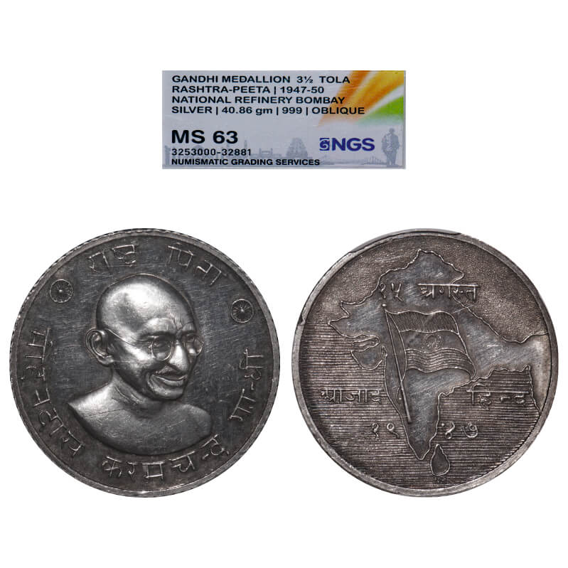 | Gandhi Medallion Silver, 40.86g, (3 1/2 Tola), Obv: Mohandas Karamchand Gandhi, Rashtra Peeta, Rev: India Map, Azad Hind 15th August 1947, made by National refinery Bombay Oblique Milling. NGS graded MS 63, Rare. |