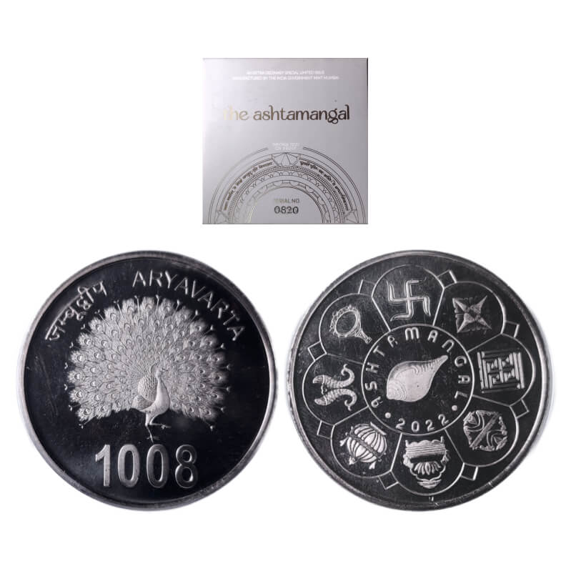 INDIA GOVT MUMBAI MINT, Silver Token, 40.00g. THE ASHTA MANGAL, SR NO 0820, In Original Box Packaging. Uncirculated, Scarce.