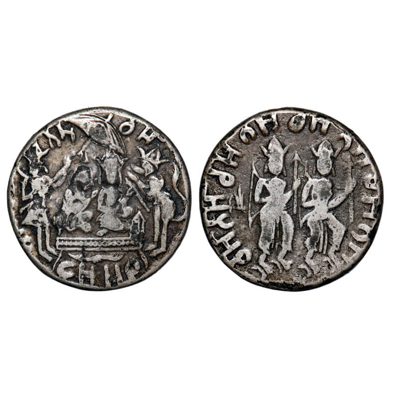 | Temple Token, Ramdarbar, Sikh Related Ramatanka Token, Silver, 11.84g Obv. Depicting the Ramdarbar, with Lord Rama and his consort Sita seated on Throne , Laxmana holding a parasol Above them. Hanuman standing with folded hands in front of them. Gurmukhi legend around - Ram Nam Sat Nam Rev. - Lord Rama and his brother Lakshmana standing holding bow and arrows , after the fire altar symbol Gurmukhi couplet around - Ram Nam Ram Nam". Very Fine, Scarce. |