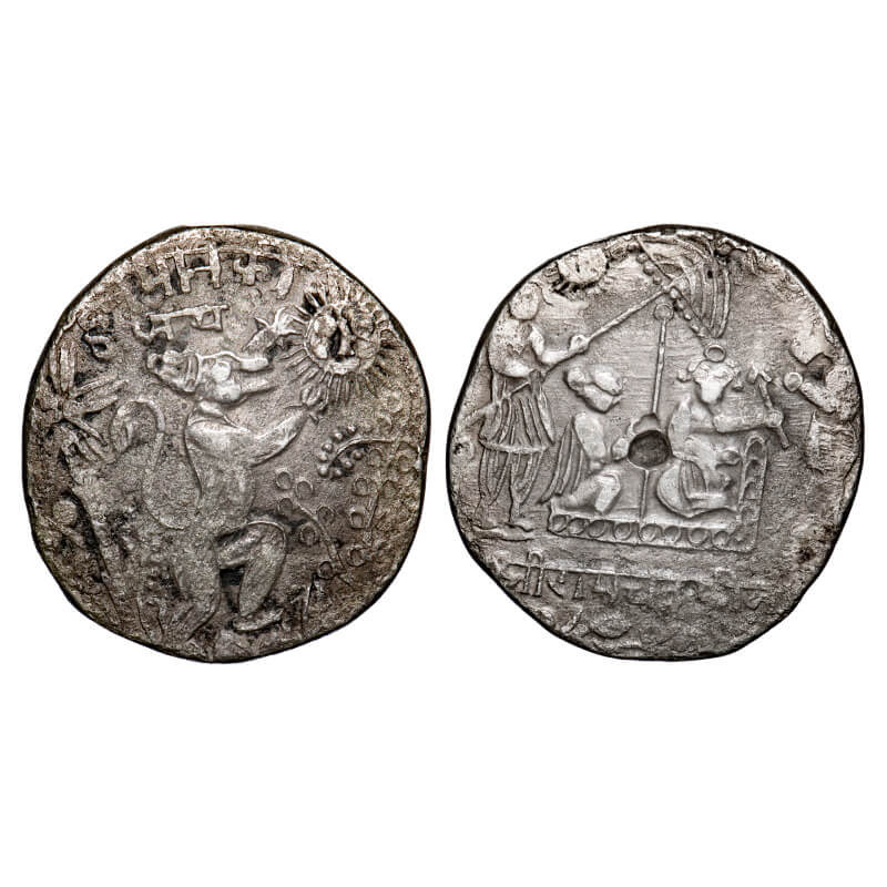 | Temple Token, White Metal, 13.35g, concave early 20th century, Hanuman Tanka, obv. Hanuman flying carrying Sanjivani mountain, Nagari legend around; Ram durbar and SHr Ramjchandra Ji in nagari belowon rev. About Very Fine, Scarce. |