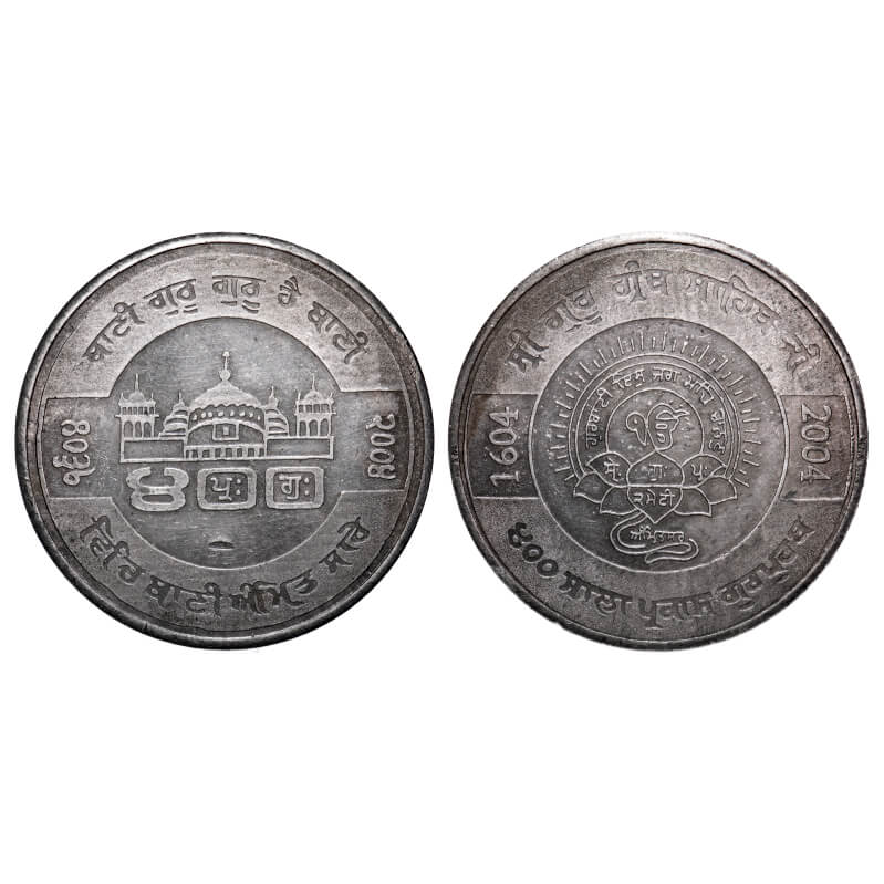 | Sikh Token, Silver fine (999), 50.100g, 50.40mm, 400 th ANNIVERSARY OF SRI GURU GRANTH SAHIB JI ( 1604 - 2004 ), 2004, Obv: The Golden Temple at Amritsar withina circle and Gurumukhi legend " BANI GURU GURU HAI BANI / WHICH BANI AMRIT SARE ", Rev: SGPC MOTO IN CENTRE REPERSENTING LOTUS AND SUN , (' EK OMKAR ' GURBANI IS JAG MAE HI CHANAN ) SHIROMANI GURUDWARA COMMITTEE AMRITSAR NOTE: The Shiromani Gurdwara Parbandhak Committee (SGPC) Amritsar officially issued this silver token for commemorating the 400th Anniversary of Sri Guru Granth Sahib Ji. Rainbow Toned, Uncirculated, Scarce. |