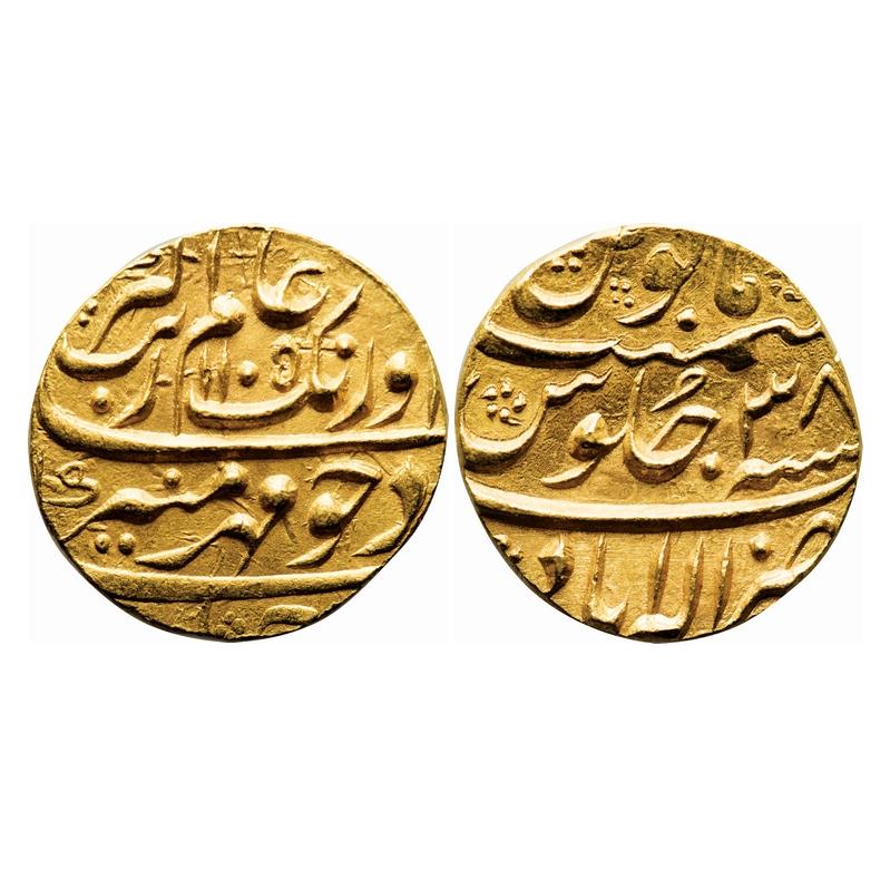 Aurangzeb, Gold Mohur, 11.09g, Allahabad Mint, AH 1105/38 RY, Mirh-e-munir couplet, with complete mint. KM 315.9. Extremely Fine, Rare.