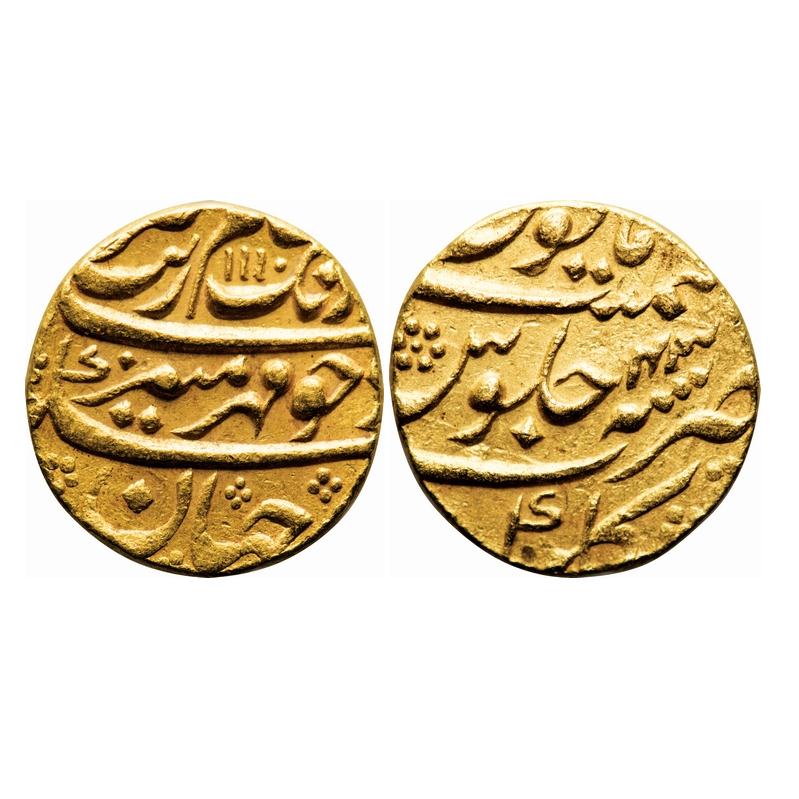 Aurangzeb, Gold Mohur, 10.99g, Dar-ul-Jihad (Hyderabad) Mint, AH 1116/48, Mirh-e-munir couplet. KM ...