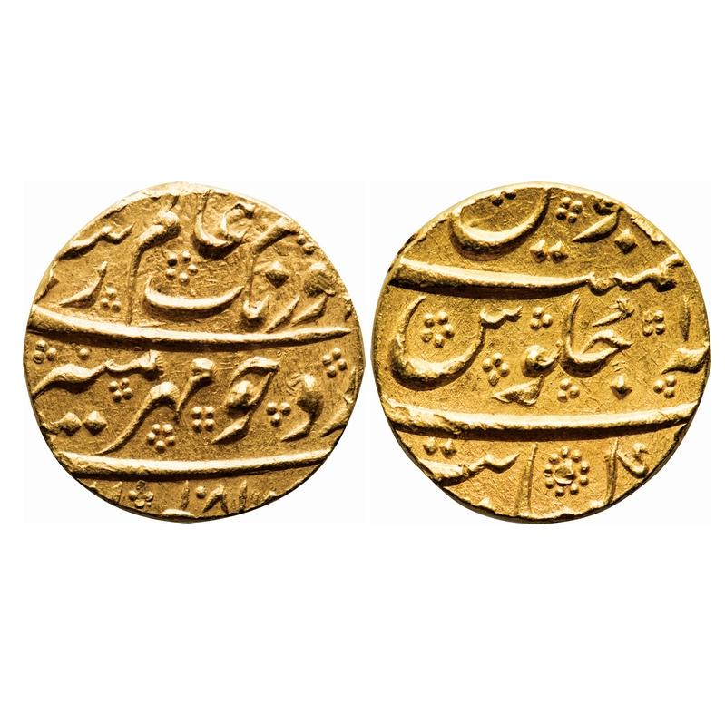 Aurangzeb, Gold Mohur, 11.06g, Khambayat Mint, AH 1081/1(4) RY, Mirh-e-munir couplet, the date placed at bottom rather than the usual placement within the king’s name. KM 315.27. Nice mint luster, About Extremely Fine, Rare. |