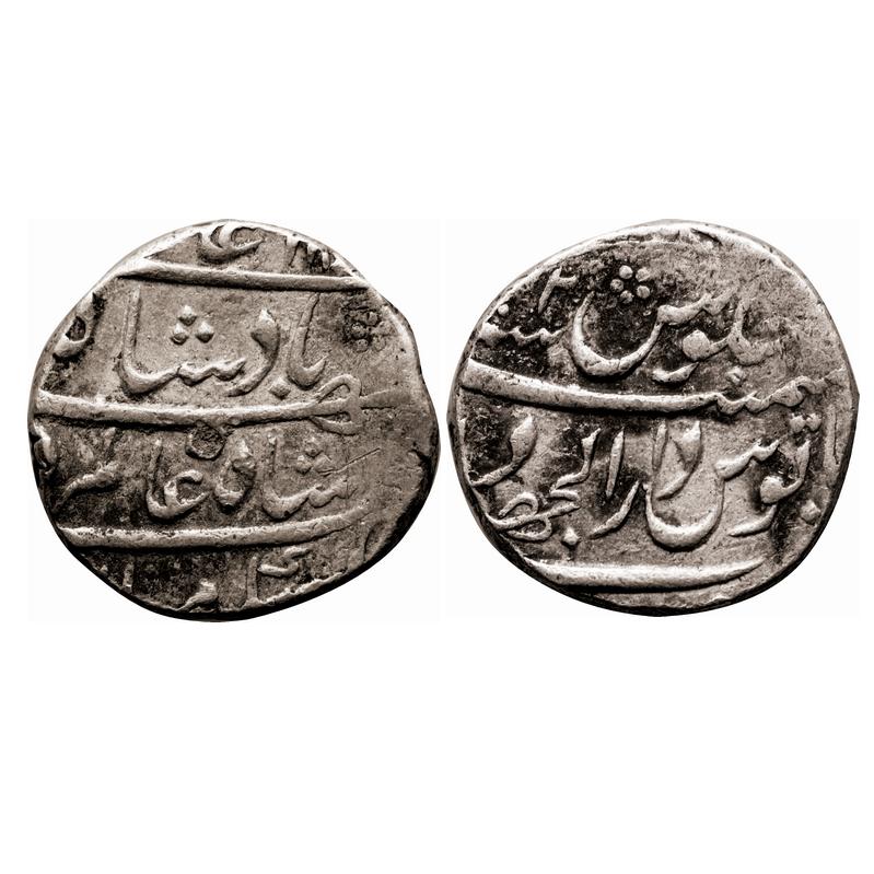 Shah Alam Bahadur, Silver Rupee, 11.43g, Dar ul Jihad (Hyderabad) Mint, AH 11xx/2 RY. KM Unlisted type in silver rupee. Test mark, About Very Fine, Very Scarce.