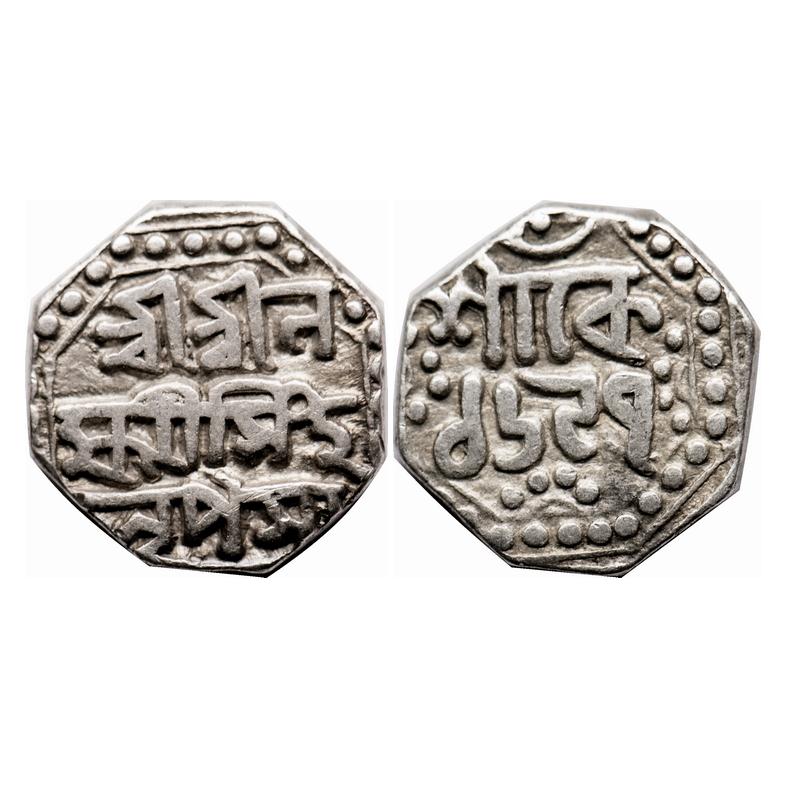 Assam, Silver 1/4 Rupee, 2.76g, Laxmi Simha, SE 1699. Obv: Sri Sri La / xmi Simha / Nripasya, Rev: ...