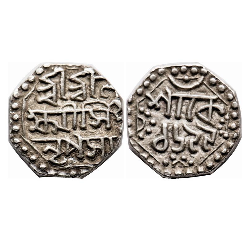 Assam, Silver 1/4 Rupee, 2.76g, Laxmi Simha, SE 1699. Obv: Sri Sri La / xmi Simha / Nripasya, Rev: Sake 1697. A.Mitra 312. Extremely Fine, Scarce.