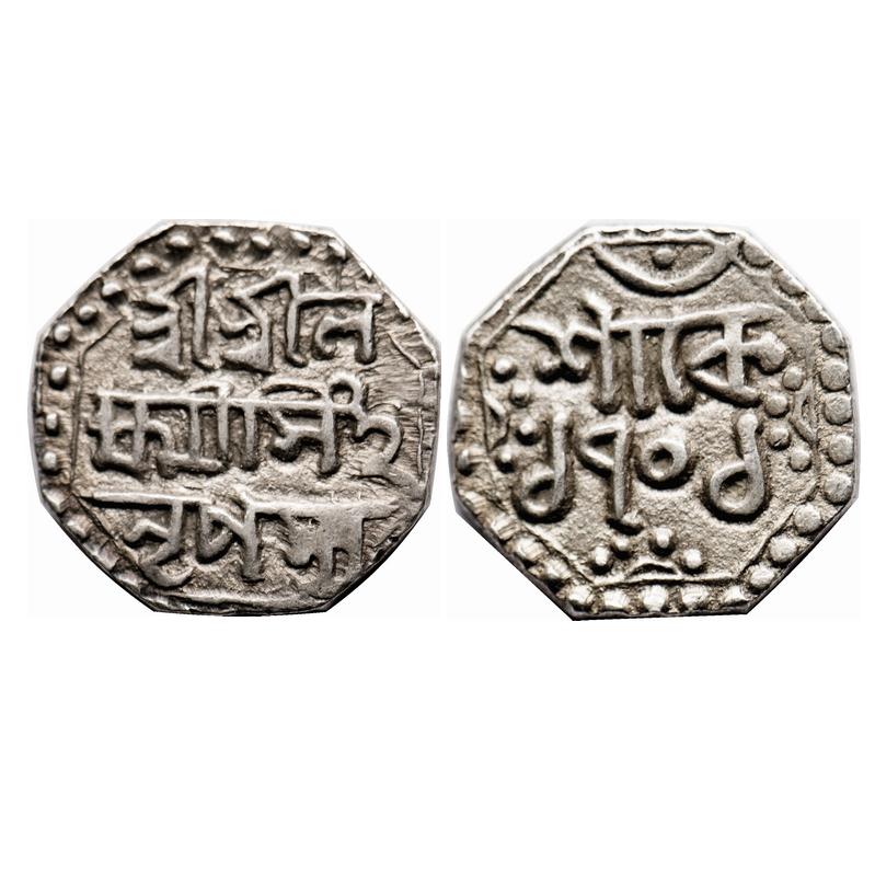 Assam, Silver 1/4 Rupee, 2.82g, Laxmi Simha, SE 1701. Obv: Sri Sri La / xmi Simha / Nripasya, Rev: Sake 1701. A.Mitra 314. About Very Fine, Scarce.