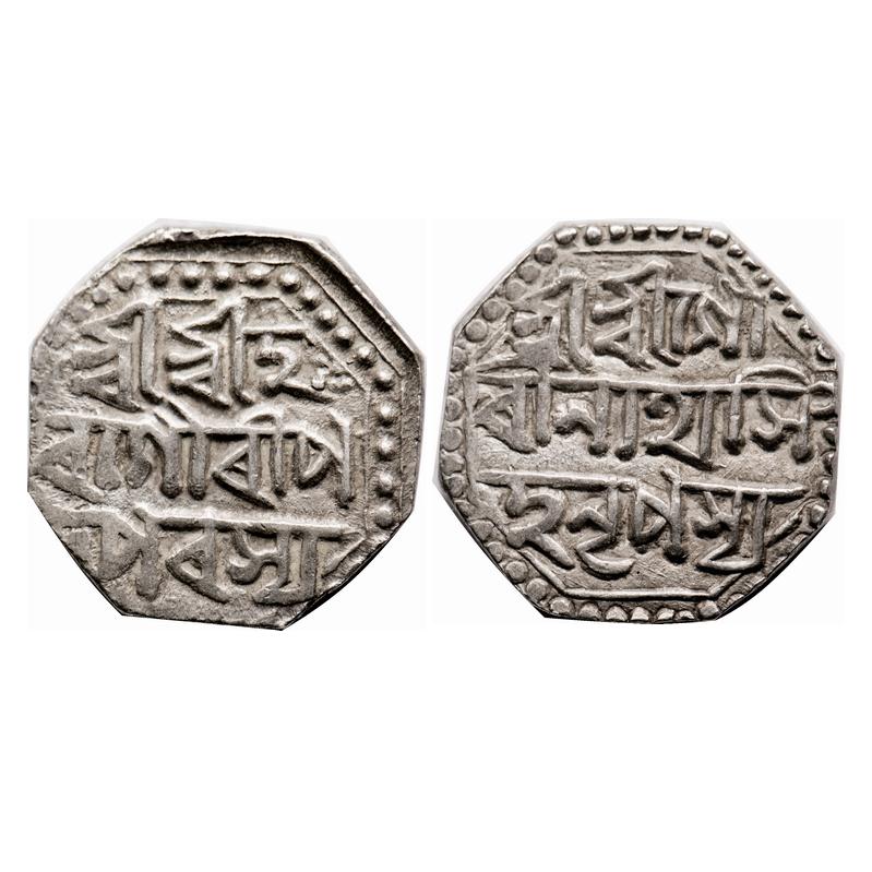 Assam, Silver, 1/2 Rupee, 5.64g, Gaurinatha Simha, Obv: Sri Sri Ha / ra Gauri Pa / da Parasya, Rev: Sri Gau / rinatha Sim / ha Nripasya. A.Mitra 377a Unlisted. Very Fine+, Scarce.