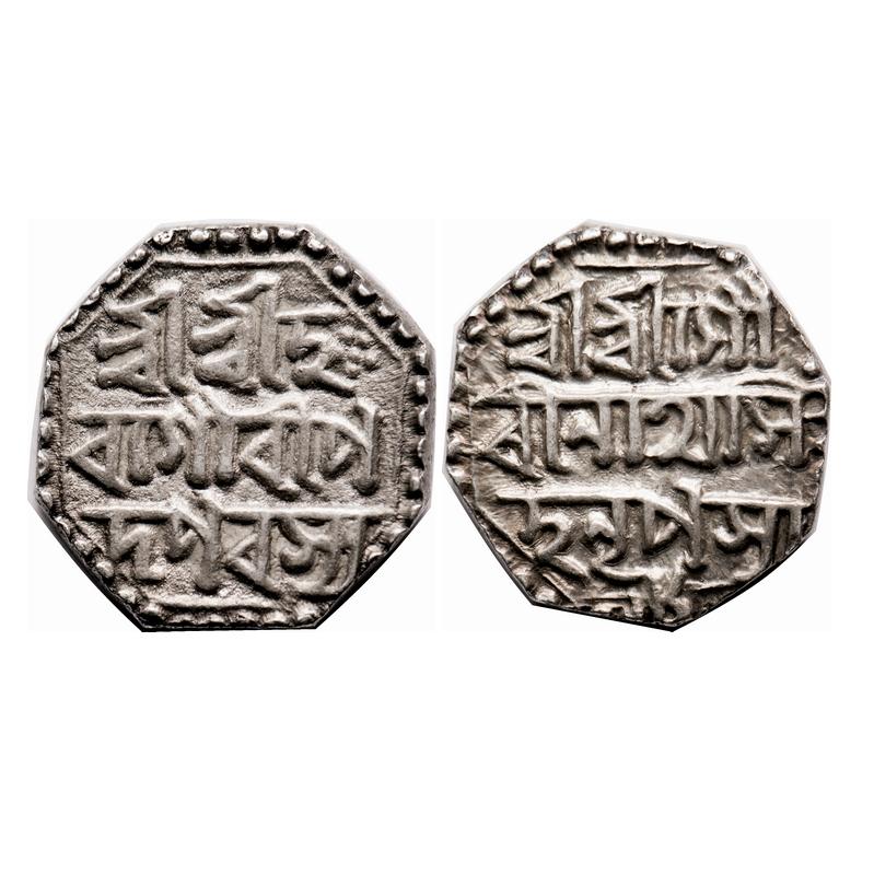 Assam, Silver, 1/2 Rupee, 5.64g, Gaurinatha Simha, RY 8, Obv: Sri Sri Ha / ra Gauri Pa / da Parasya, Rev: Sri Gau / rinatha Sim / ha Nripasya, 8 below. A.Mitra 385. Very Fine+, Scarce. |