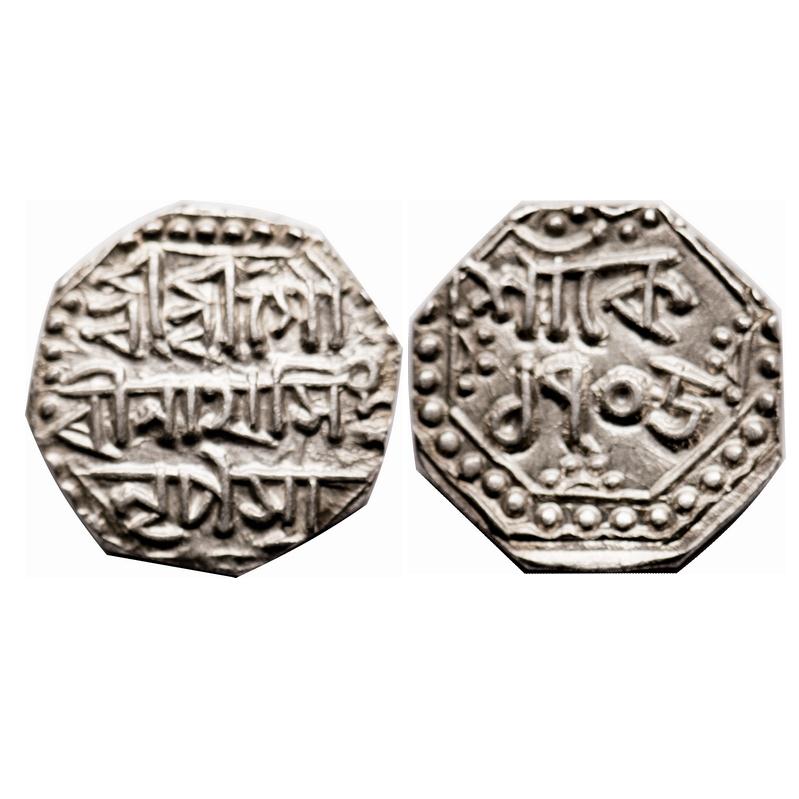 Assam, Silver, 1/4 Rupee, 2.88g, Gaurinatha Simha, SE 1705, Obv: Sri Sri Gau / rinatha Simha / Nripasya, Rev: Sake 1705. A.Mitra 403. Extremely Fine, Scarce. |