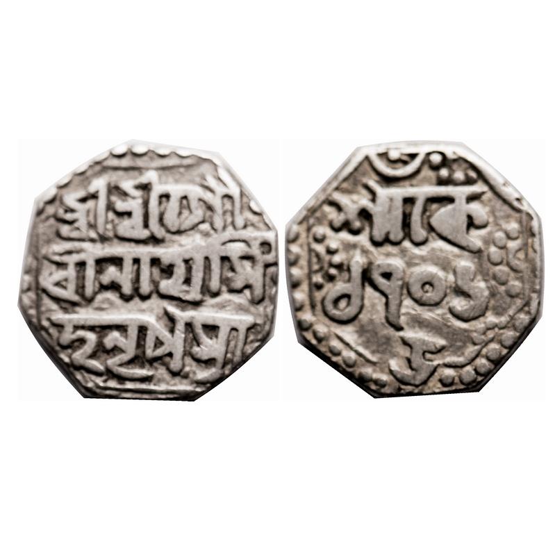 Assam, Silver, 1/4 Rupee, 2.76g, Gaurinatha Simha, SE 1706 / 5 RY, Obv: Sri Sri Gau / rinatha Sim / ha Nripasya, Rev: Sake 1706 / 5. A.Mitra 404. About Very Fine, Scarce. |