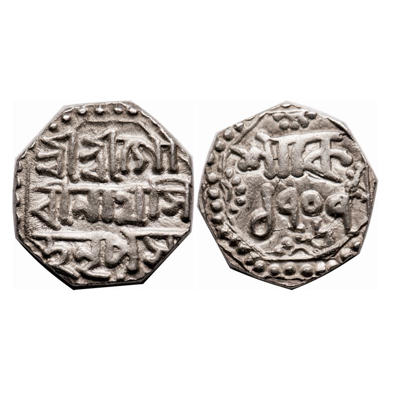Assam, Silver, 1/4 Rupee, 2.87g, Gaurinatha Simha, SE 1707 / 6 RY, Obv: Sri Sri Gau / rinatha Sim / ha Nripasya, Rev: Sake 1707 / 6. A.Mitra 405. Very Fine, Scarce. |