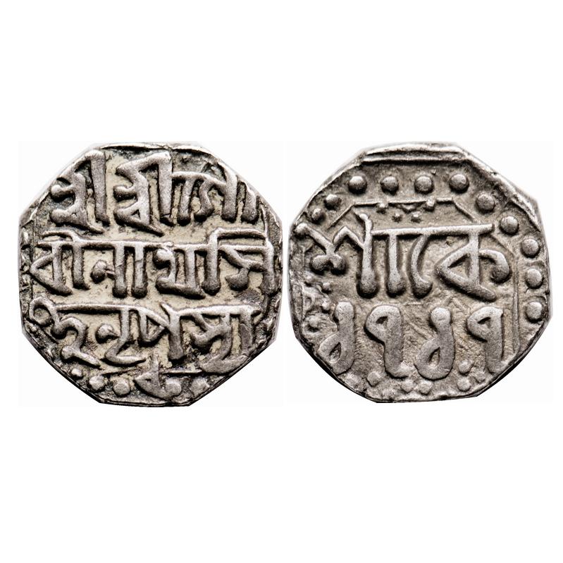 Assam, Silver, 1/4 Rupee, 2.86g, Gaurinatha Simha, SE 1717, 1 RY, Obv: Sri Sri Gau / rinatha Si / mha Nripasya, 1, Rev: Sake 1717. A.Mitra 426. Very Fine, Very Scarce. |
