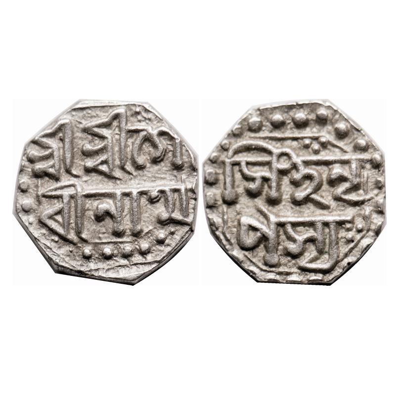 Assam, Silver, 1/8 Rupee, 1.47g, Gaurinatha Simha, Obv: Sri Sri Gau / rinatha, Rev: Simha / Nripasy...