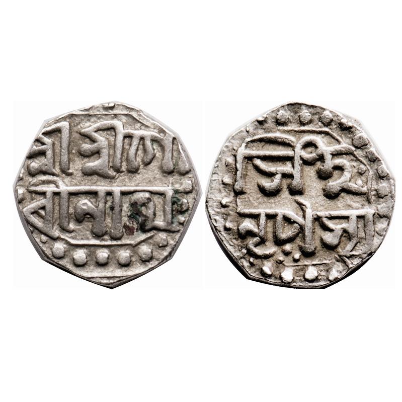 Assam, Silver, 1/8 Rupee, 1.47g, Gaurinatha Simha, Obv: Sri Sri Gau / rinatha, Rev: Simha / Nripasya. A.Mitra 430. Very Fine+, Scarce.