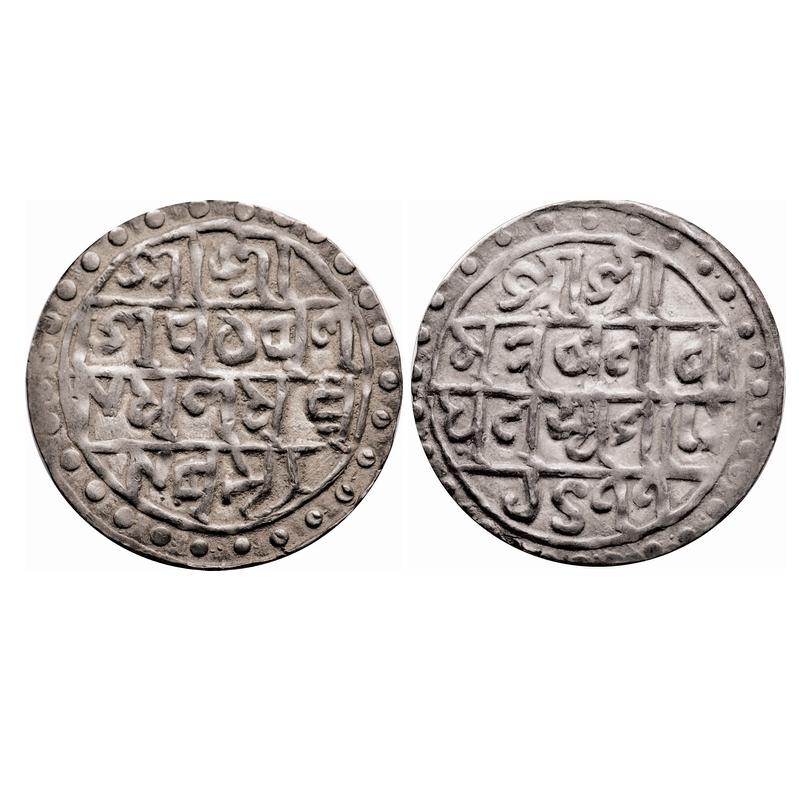 Cooch Behar, Silver Rupee, 10.33g, Nara Narayan (1555/1587 AD), SE 1477. Archaic Bengali Script. Obv: Sri Sri / Siva Charana / Kamala Madhu / Karasya. Rev: Sri Sri / Man Nara / narayana Sake / 1477, Broad flan. Bose A-6.5. Extremely Fine, Scarce.