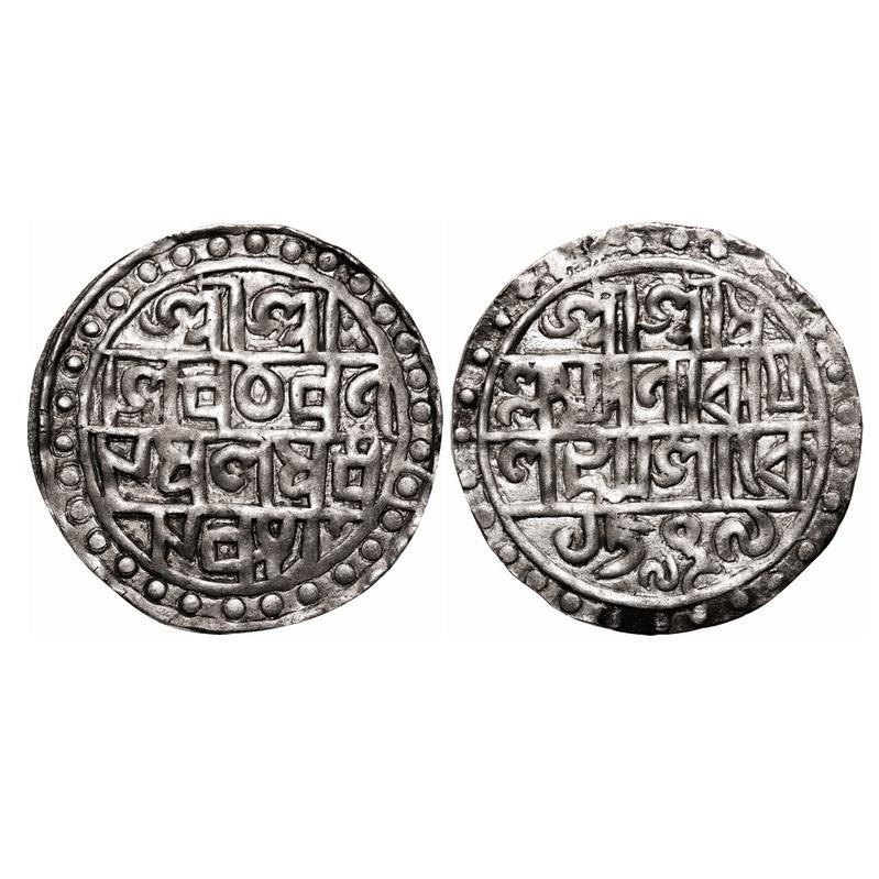 Cooch Behar, Silver Rupee, 10.11g, Lakshmi Narayan (1587/1627 AD), SE 1509 / 98, Obv: Sri Sri / Siva Charana / Kamala Madhu / Karasya. 3 dots after shri, Rev: Sri Sriman/ Lakshmi Naraya / na sya Sake 1509 / 98 (sakabda Year) added below. RB B2.13 type. Very Fine+, Scarce.