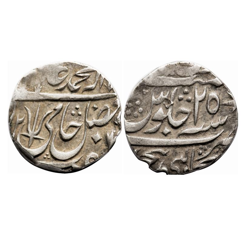 Maratha Confederacy, Silver Rupee, 11.14g, Kalpi Mint, in the name of Shah Alam II, 25 RY, with clear kalpi hijri mint at bottom. M&W T3. About Very Fine, Scarce.