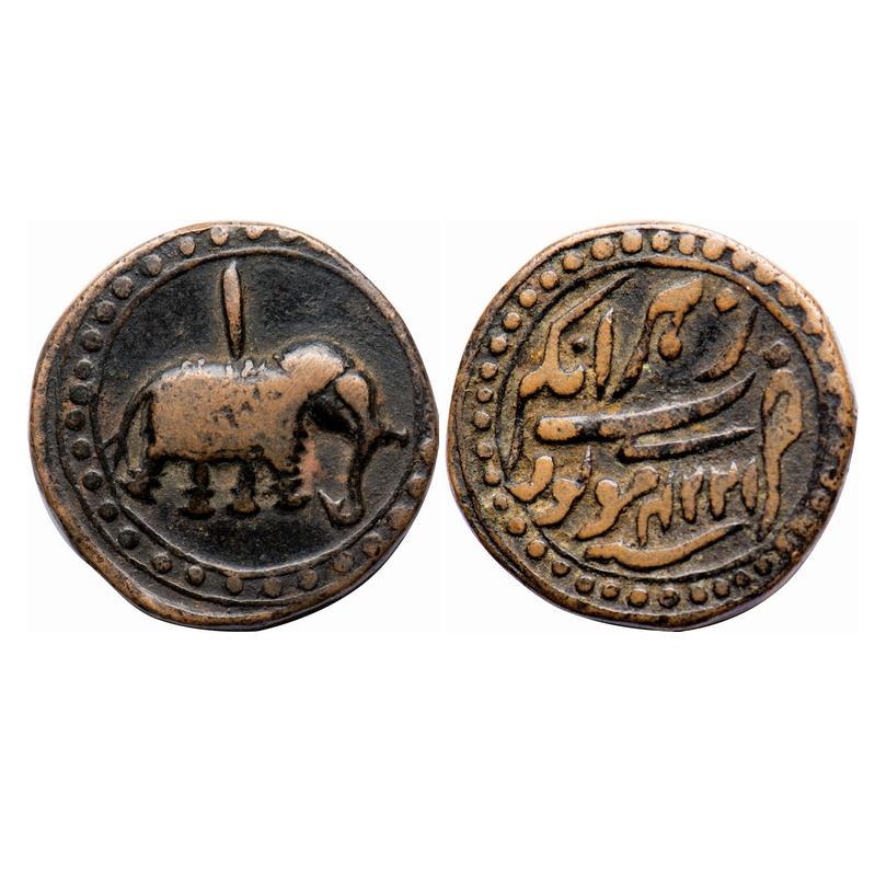 | Mysore, Copper Paisa, 11.05g, Tipu Sultan (1787-1799 AD), Nagar Mint, AM 1224 (retrograde). Obv: Elephant left with persian 'Alif' above, Rev: Zohra Zarb Nagar and maludi date 1224, with dotted borders both sides. KM 103.6 / Henderson 249. Very Fine, Scarce. |