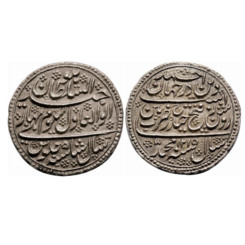 | Mysore, Silver Rupee, 11.36g, Tipu Sultan (1787-1799 AD), Patan Mint, AH 1215 / 5 RY, Ornamented Rossets, broad flan with complete dotted borders. KM Unlisted/Henderson Unlisted. Choice, Mint State. Extremely Rare. |