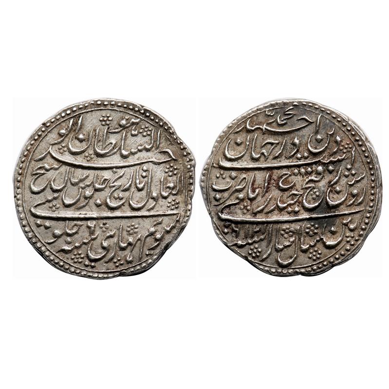 | Mysore, Silver Rupee, 11.30g, Tipu Sultan (1787-1799 AD), Patan Mint, AH 1216 / 6 RY, Ornamented Rossets (which generaly dosent come in this date), Almost complete dotted borders. KM 126/Henderson 53a. stains, Extremely Fine+. Rare. |