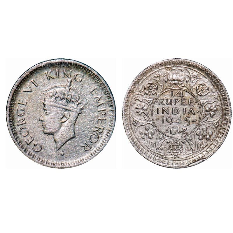 | George VI, Half Silver, 1/4 Rupee, 1945, lahore Mint, Head Type II, Rev II, 'L' raised, Security edge. GK 1345. Extremely Fine, Cleaned. Rare. |