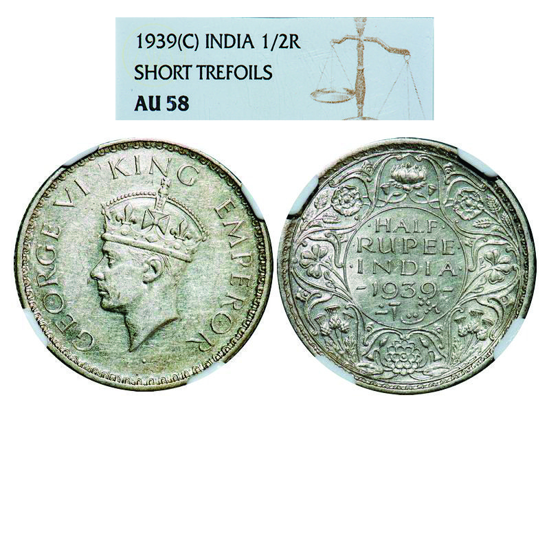 | George VI, Silver, Half Rupee, 1939, Calcutta Mint, A(a)/I, Head Type II, No dot, Milled edge. GK 1298. NGC Slabbed AU 58. Very Scarce. |