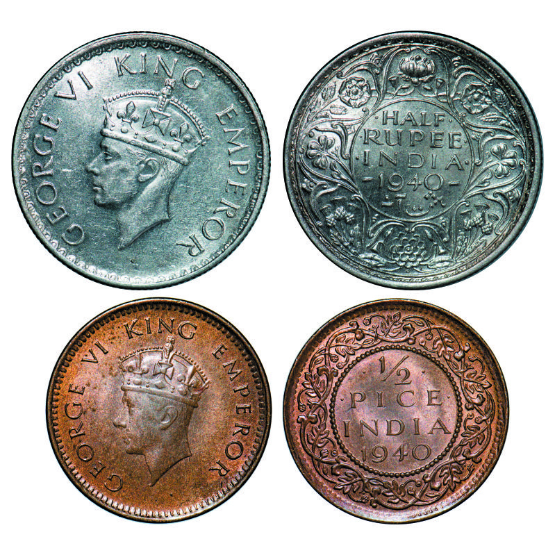 | George VI, Mix Metal, Half Rupee, 1/2 Pice, (2 coins), 1940, 1) Half Silver, Bombay Mint, A(a)/I, Head Type II, Dot, Milled edge, Tiny Diamond shape pyramis on Obv and Rev, 2) Bronze, Calcutta Mint, Head Type I, No dot. GK 1299, 1452. Mint Grade. Very Scarce. |