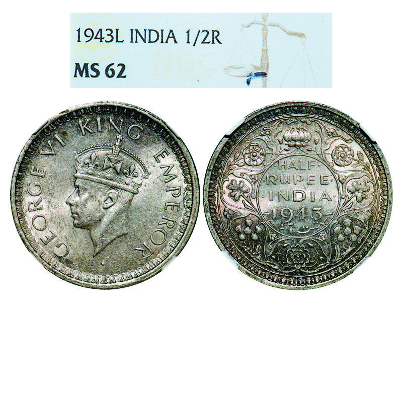 | George VI, Half Silver, Half Rupee, 1943, Lahore Mint, B/II, 'L' raised, Head Type II, Security edge, Rev lettering w/o serif. GK 1308. NGC Slabbed MS 62. Very Rare. |