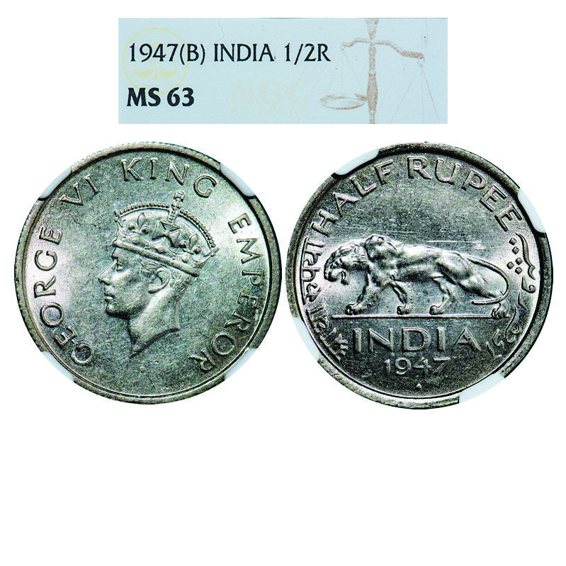 | George VI, Nickel, Half Rupee, 1947, Bombay Mint, C/IV, Head Type II, Diamond mint mark, Milled edge, 3 Tiny shaped pyramis on Rev. GK 1322. NGC Slabbed MS 63. Very scarce. |