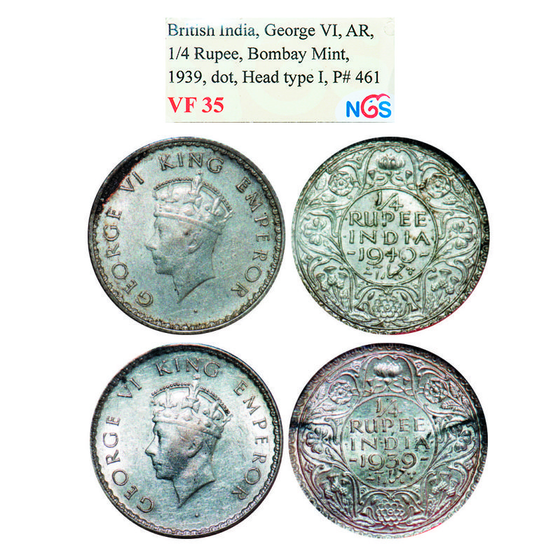 | George VI, Half Silver, 1/4 Rupee, (2 coins), 1939, 1940, Bombay Mint, Head Type I, Rev I, Dot, Milled edge, Both Slab coins have tiny diamond shaped pyramis on Obv and Rev. GK 1323, 1326. NGS Slabbed VF 35, XF 40. Scarce. |