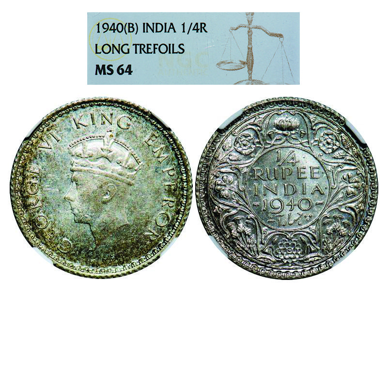 | George VI, Half Silver, 1/4 Rupee, 1940, Bombay Mint, Head Type I, Rev I, Dot, Milled edge. GK 1326. NGC Slabbed MS 64. Rare. |