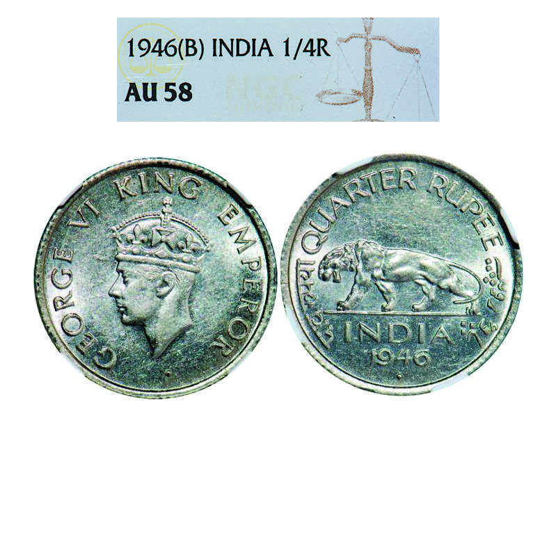 | George VI, Nickel, 1/4 Rupee, 1946, Bombay Mint, Head Type II, Rev IV, Diamond mint mark, Milled edge, 11 o'clock die rotation on Rev. GK 1346. NGC Slabbed AU 58. Scarce. |